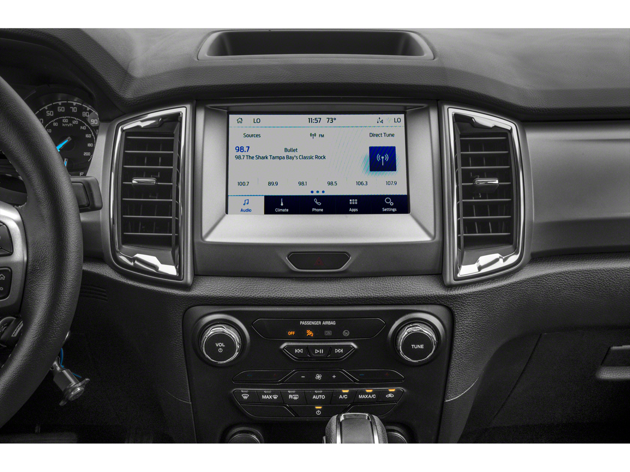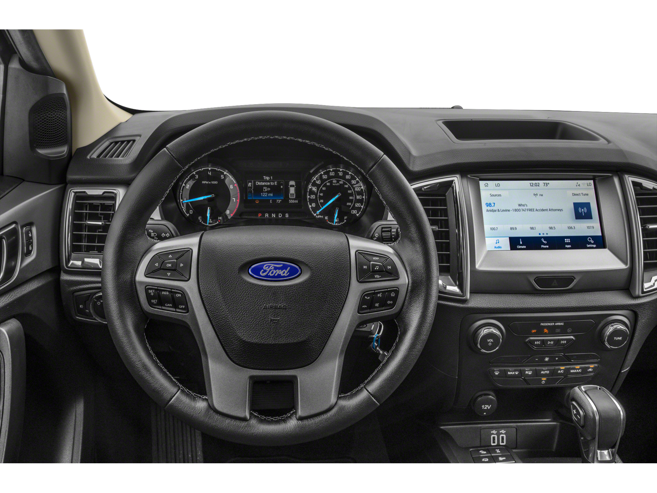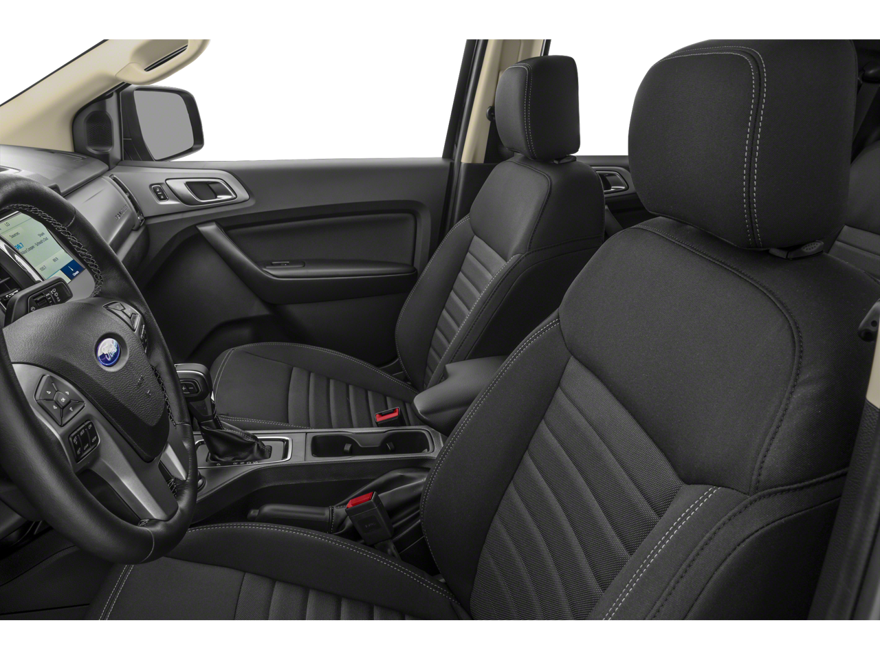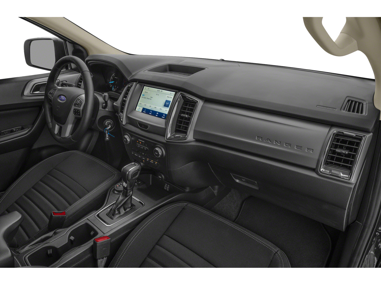 Inside, the Ranger XLT pampers you with premium touches like leather-wrapped steering and shift knob, dual-zone automatic climate control, and an 8-way power driver's seat. The spacious cabin offers ample room for passengers and cargo, with the added convenience of a sliding rear window and a retractable tonneau cover.
