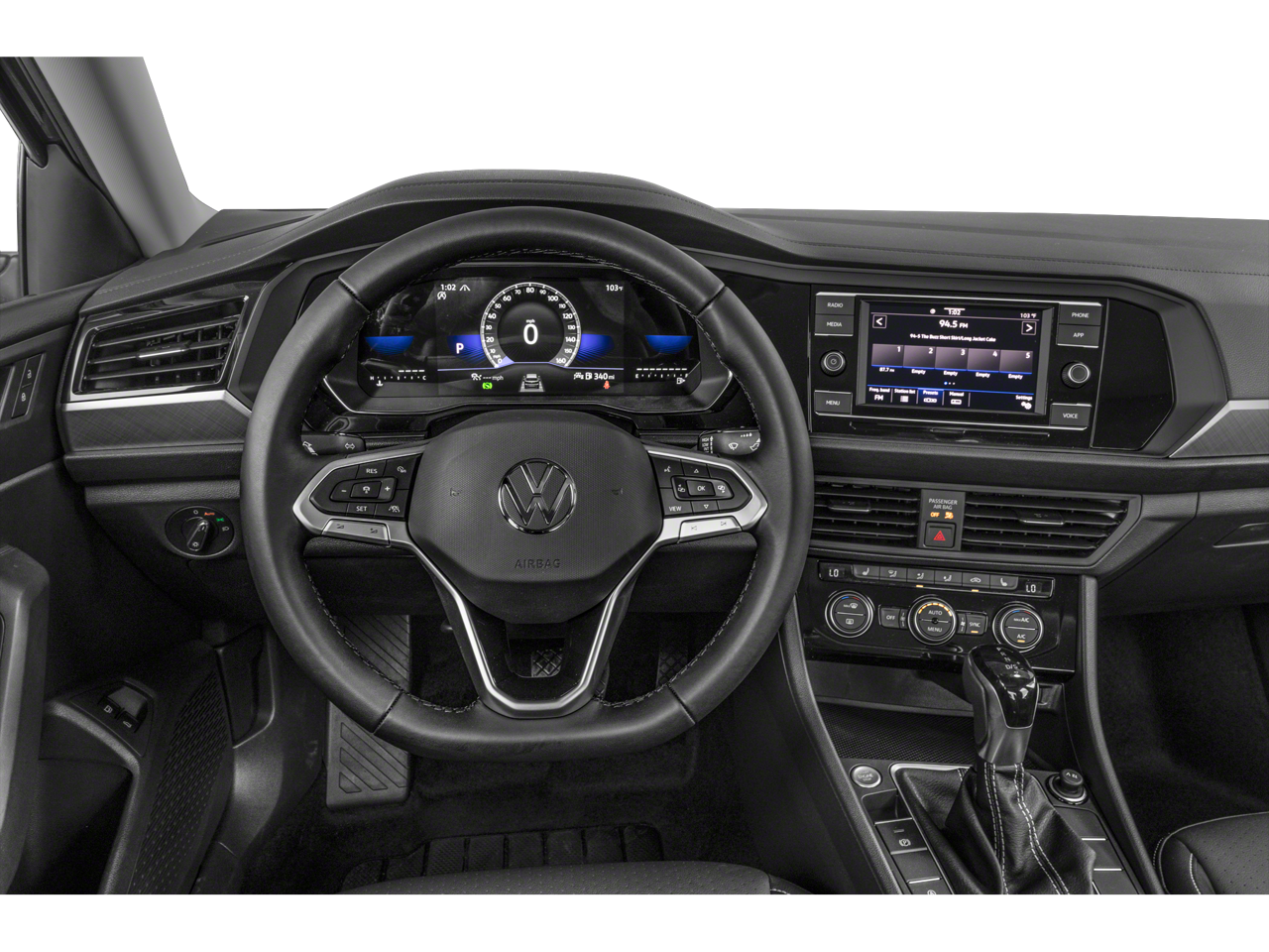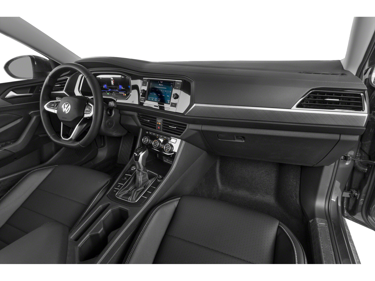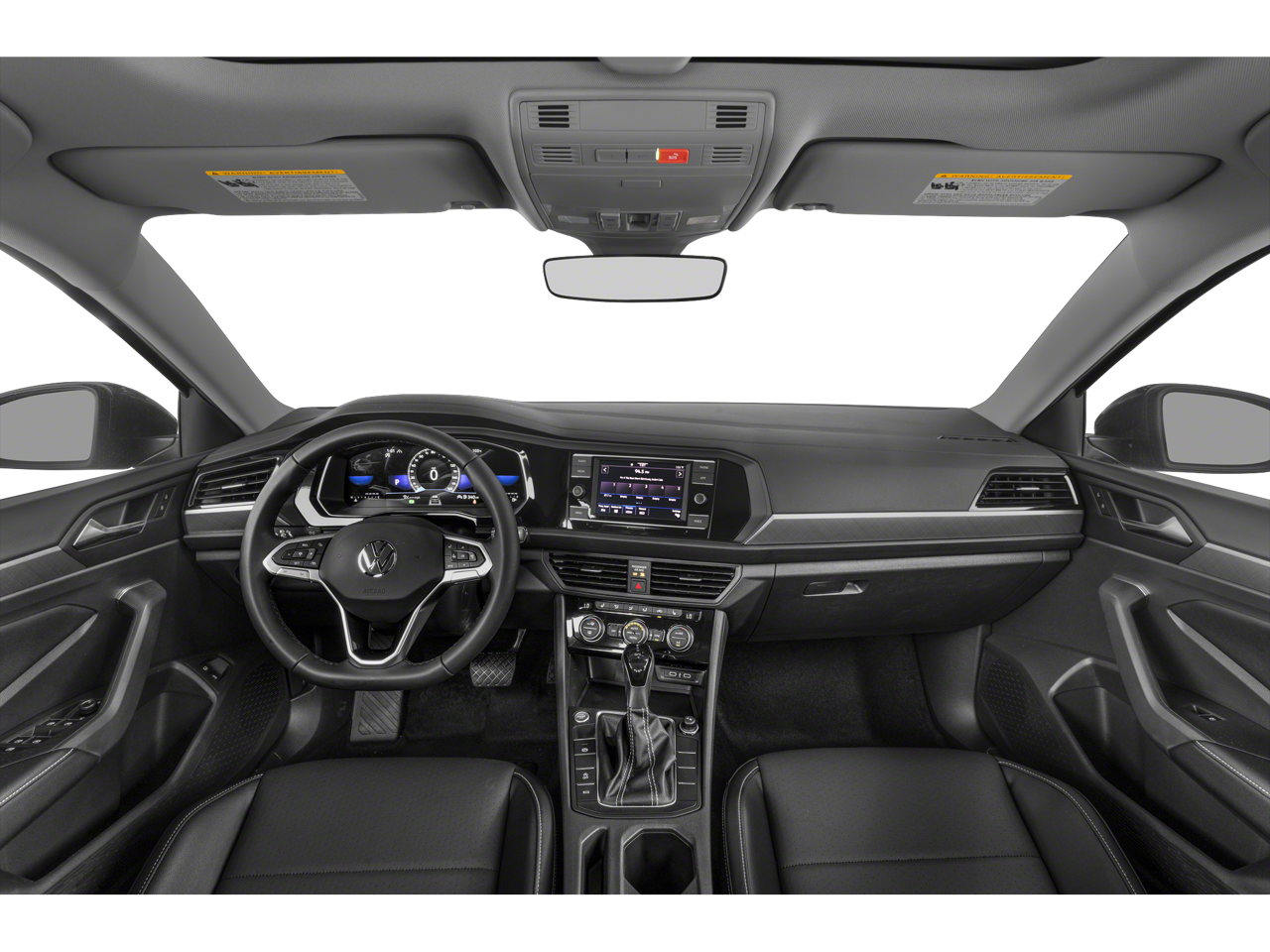 The Panoramic Sunroof Package is a standout feature, offering an expansive view of the sky and letting natural light flood the cabin. Dual front reading lights, illuminated vanity mirrors, and an overhead storage compartment add to the Jetta's premium feel, while the power tilting and sliding panoramic sunroof provides an open-air driving experience.